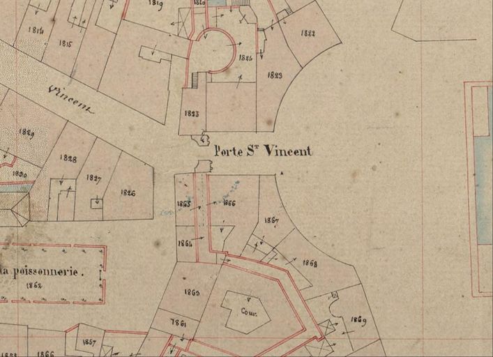 Plan cadastral de 1844 : section K8 détail porte Saint-Vincent. AD Morbihan 3P297/56.Immatriculation