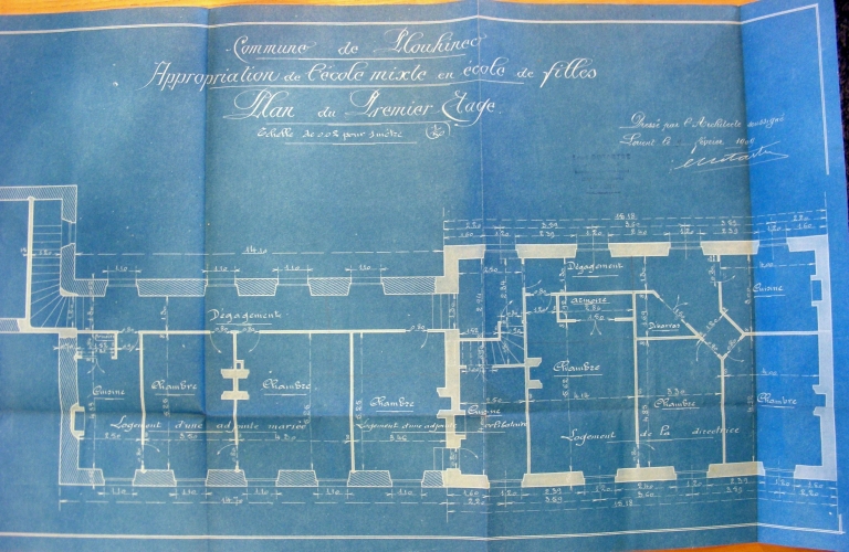 Agrandissement de la mairie-école en école de filles. Plan de l'étage par Louis Dutartre, 1909 (AD Morbihan, 2O169/1420)Immatriculation