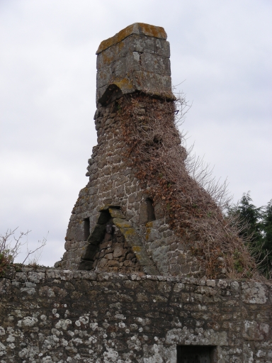 Détail : larmier de pierres plates protégeant l'ancienne toiture de l'étable, souche de cheminéeImmatriculation
