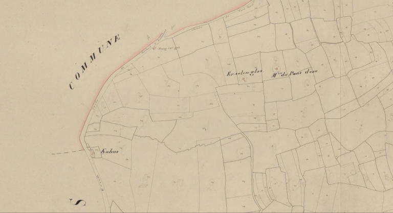 Plan cadastral 1837, section C1 : moulin à vent Er velin glas et moulin du Pont d'eau (AD Morbihan 3P407)Immatriculation