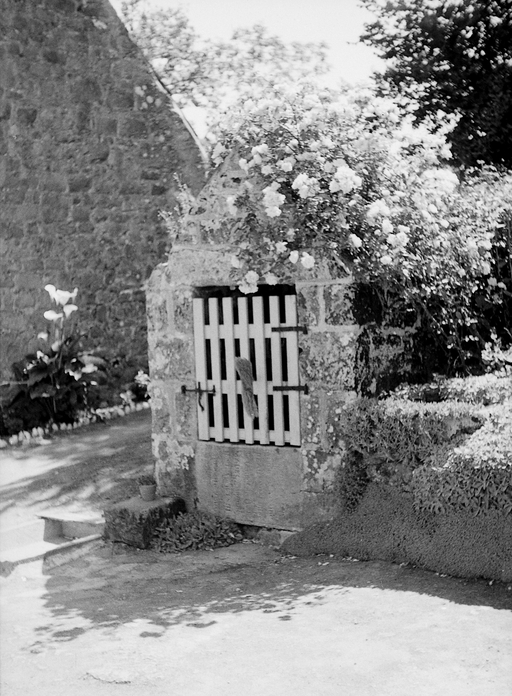 Trégrom, Penn-Ker : puits de type guérite, photographie de 1972. L'auge est formée par une ancienne pierre tombale où l'on peut encore lire : MADEC, 18_-1891Immatriculation