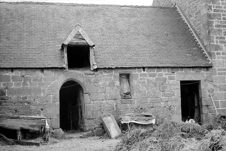Trégrom, Ar Sant (Le Saint) : ancienne ferme datable du 16e ou du 17e siècle devenue étable, photographie de 1972. Porte en arc brisé ou ogive, piedroits chanfreinés et appui de fenêtre avec saillie nous renseignent sur l'époque de constructionImmatriculation