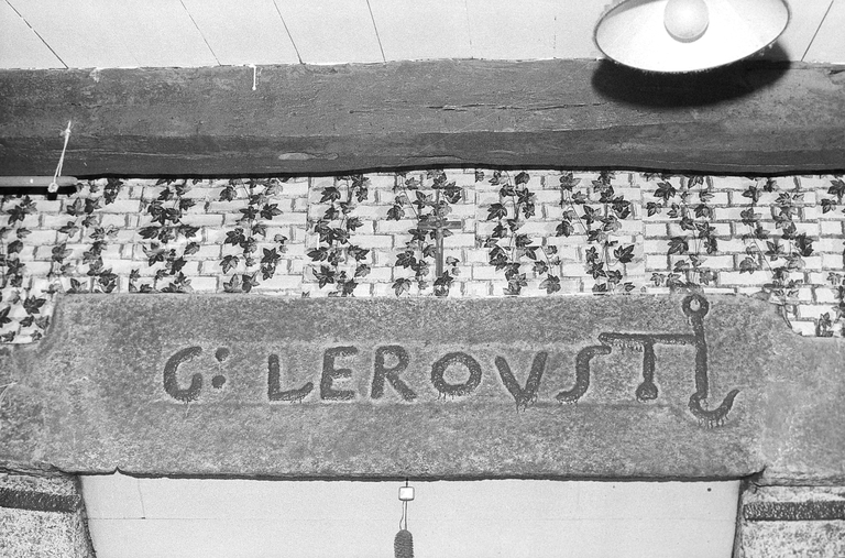 Trégrom, le bourg, ouest de l'église : maison, détail de la cheminée, photographie de 1972. Le manteau de la cheminée porte l'inscription suivante : G : LEROVSTImmatriculation