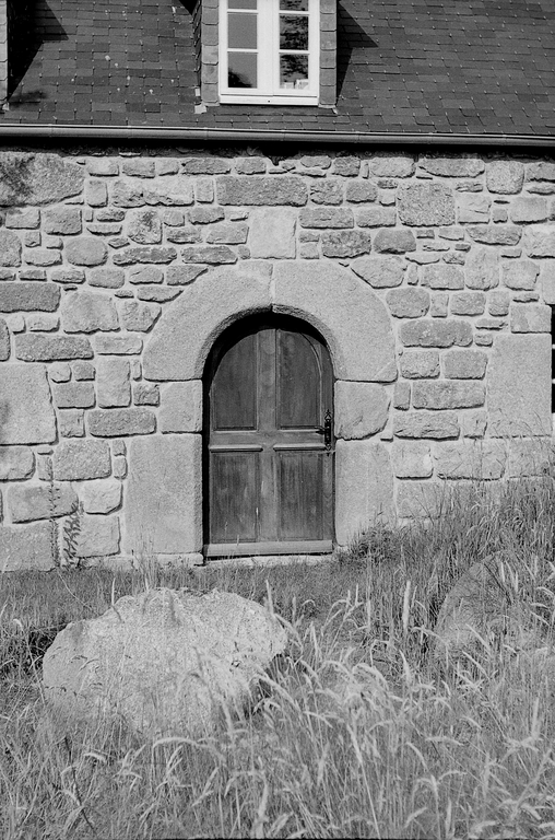 Trégrom, Pont Coz : maison du milieu, façade principale sud, détail de la porte en plein-cintre, photographie de 1972. Maison vraissemblablement construite en 1971 !Immatriculation