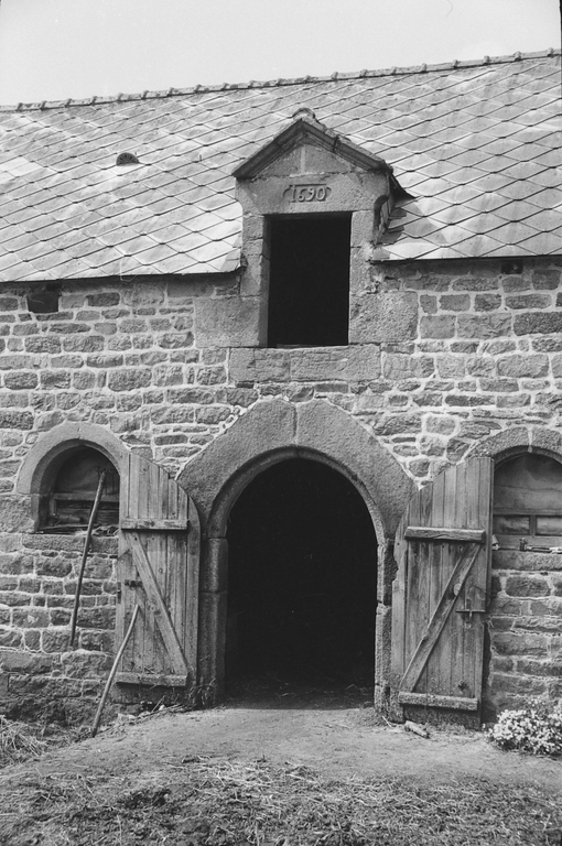 Trégrom, Kernaman-Huellan : dépendance (étable, fournil à l'extrémité est) reprenant des éléments anciens du 17e siècle, photographie de 1972. La lucarne, aujourd'hui disparue, est datée par chronogramme de 1690Immatriculation