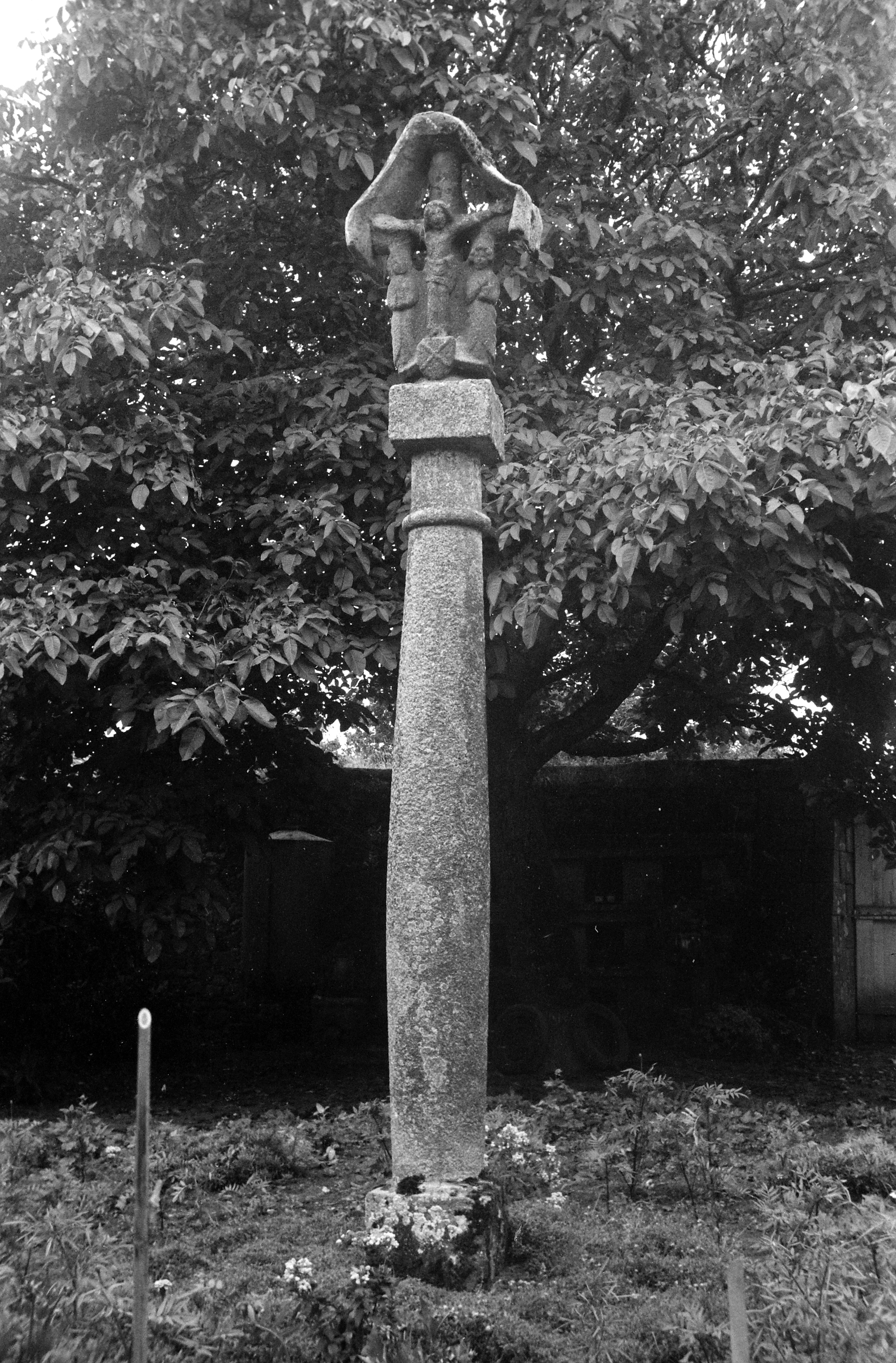 Ploubezre, le bourg : calvaire (ancienne croix de cimetière : ?) du cimetière de l'église paroissiale Saint-Pierre, vue de situation, photographie de 1969. Avers : Christ en croix et deux personnagesImmatriculation