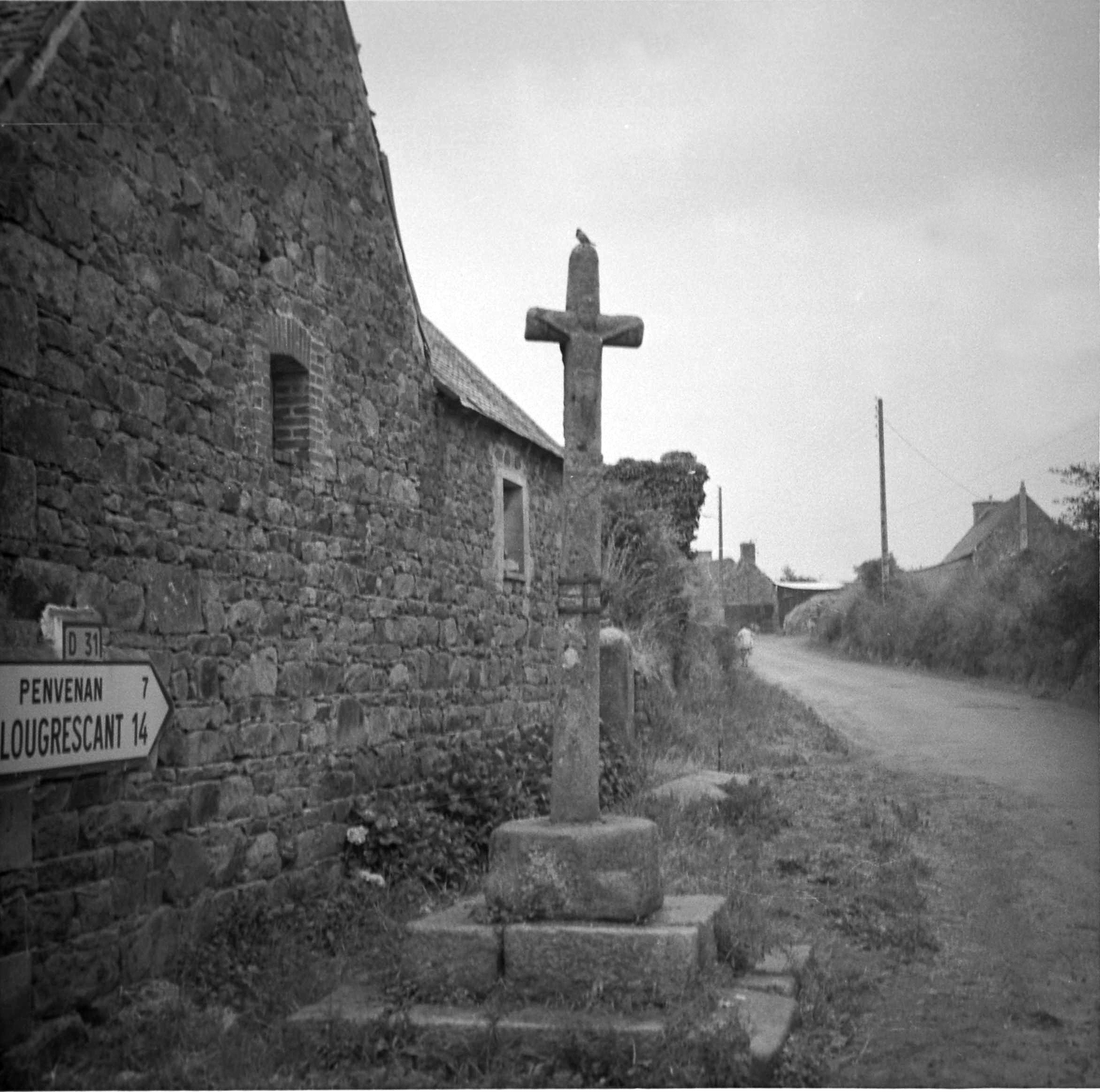 Kermaria-Sulard, le bourg : croix dite du Pavé (Christ en croix), ancienne photographie (1969-1975)Immatriculation