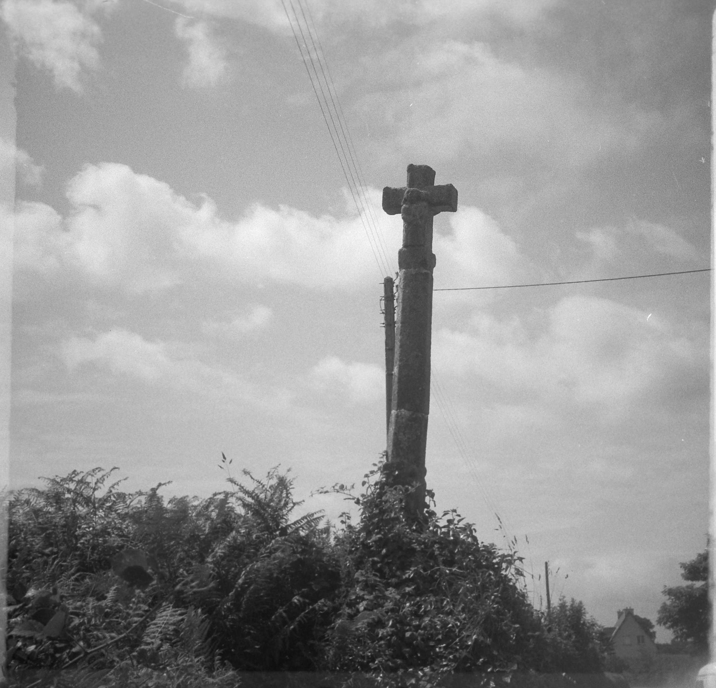 Kermaria-Sulard, Kerhuel : croix de chemin, Vierge à l'enfant, ancienne photographie (1969-1975)