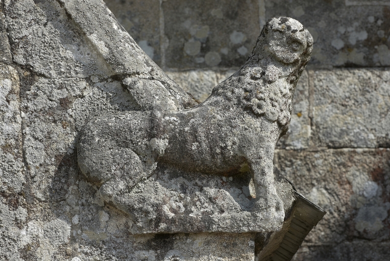 Plougras, le bourg : église paroissiale Saint-Pierre, vue de détail du décor du porcheImmatriculation