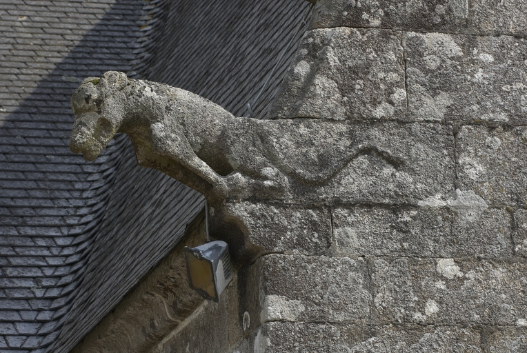 Plougras, le bourg : église paroissiale Saint-Pierre, vue de détail du décor du transept sudImmatriculation