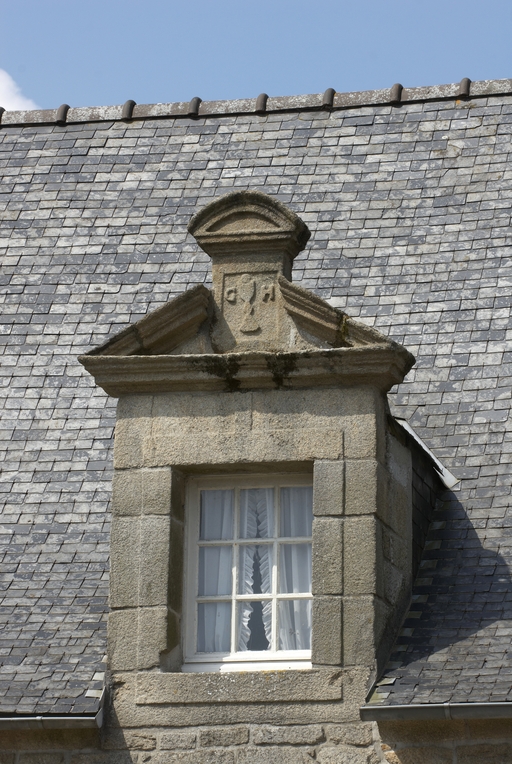 Plougras, le bourg : ancien presbytère, lucarne à fronton triangulaire brisé portant le monogramme G. H. ainsi qu'un caliceImmatriculation