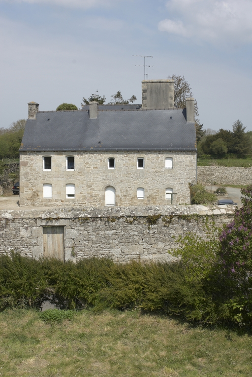 Plougras, le bourg : ancien presbytère ceint d'un mur de clôture. Façade principale orientée sudImmatriculation
