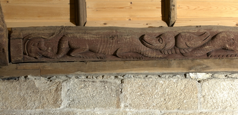 Plougras, le bourg : vue intérieure de l'église paroissiale Saint-Pierre, sablière sculptée de la nefImmatriculation