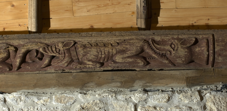 Plougras, le bourg : vue intérieure de l'église paroissiale Saint-Pierre, sablière sculptée de la nef, mur sudImmatriculation