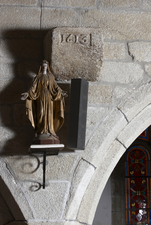 Plougras, le bourg : vue intérieure de l'église paroissiale Saint-Pierre, pierre datée 1613Immatriculation