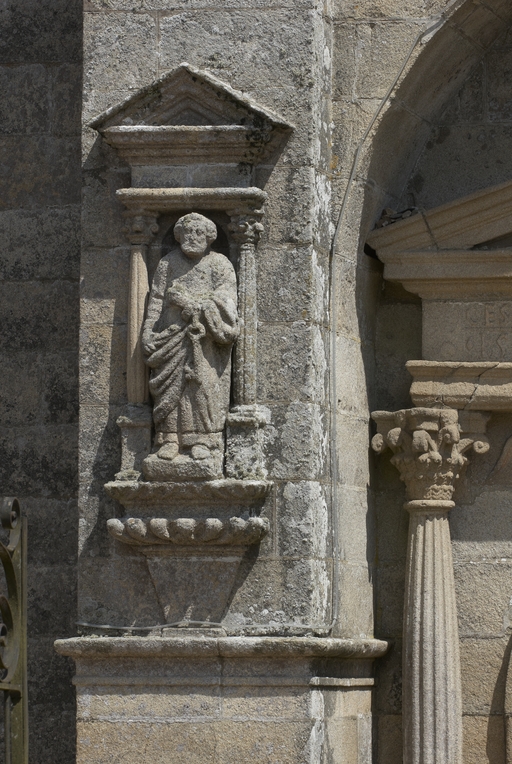 Loguivy-Plougras, le bourg : église paroissiale Saint-Emilion, vue de détail de la facade ouestImmatriculation
