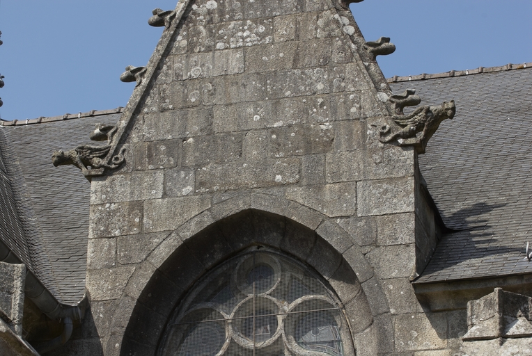 Loguivy-Plougras, le bourg : église paroissiale Saint-Emilion, vue de détail du décor du mur sudImmatriculation