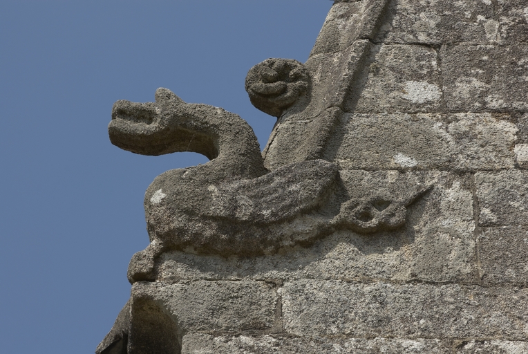 Loguivy-Plougras, le bourg : église paroissiale Saint-Emilion, vue de détail du décor du mur sudImmatriculation