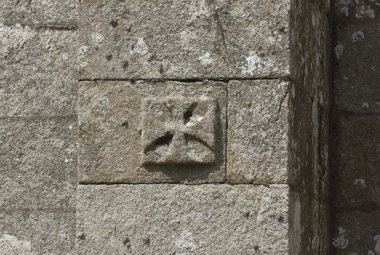 Loguivy-Plougras, le bourg : église paroissiale Saint-Emilion, vue de détail du décor du mur sudImmatriculation