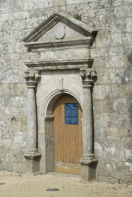 Loguivy-Plougras, le Dresnay : la chapelle Notre-Dame, porte en plein-cintre moulurée, encadrée de deux colonnes soutenant un entablement et un fronton triangulaireImmatriculation