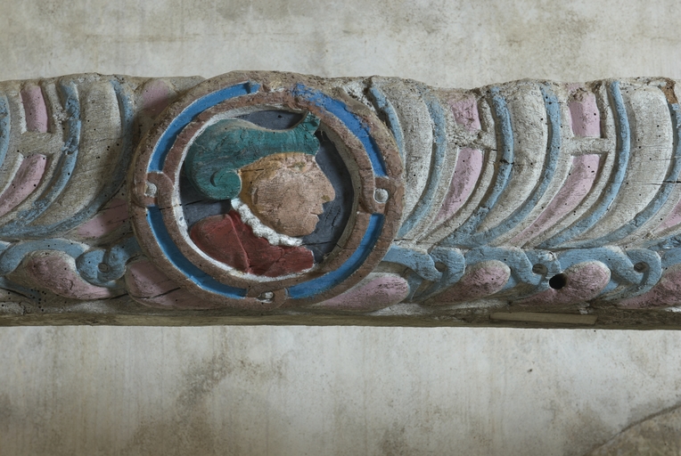 Loguivy-Plougras, le Dresnay : la chapelle Notre-Dame, vue de détail de la poutre de gloire de la nef, portrait de MonsieurImmatriculation