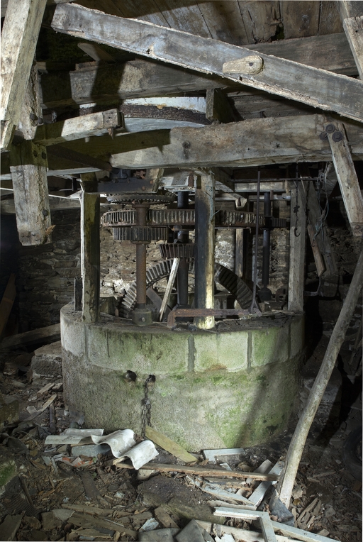 Loguivy-Plougras, Milin ar Prat : moulin, vue du mécanisme au sous-solImmatriculation