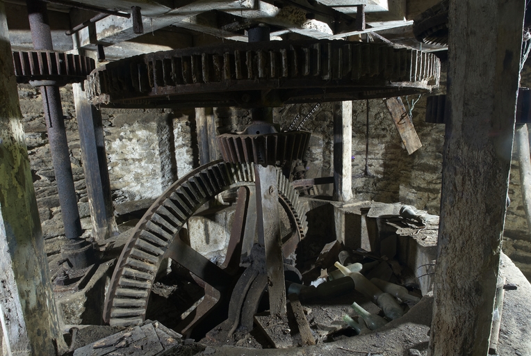 Loguivy-Plougras, Milin ar Prat : moulin, vue du mécanisme au sous-solImmatriculation