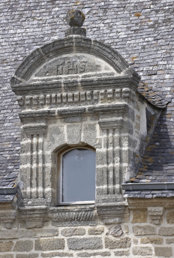 Détail : lucarne à fronton cintré, tympan avec monogramme IHSImmatriculation