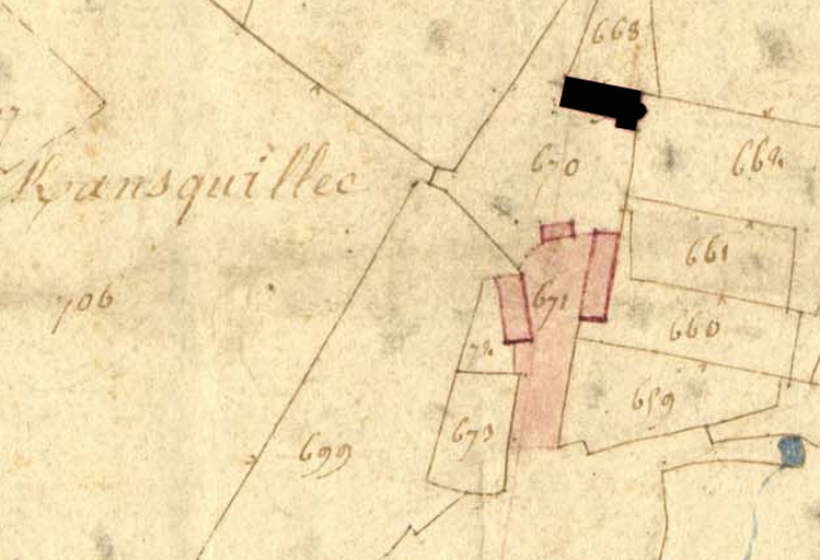 Extrait de la feuille C2 du cadastre ancien de la commune de Trégrom, 1834 : manoir de Keransquillec (en noir)Immatriculation