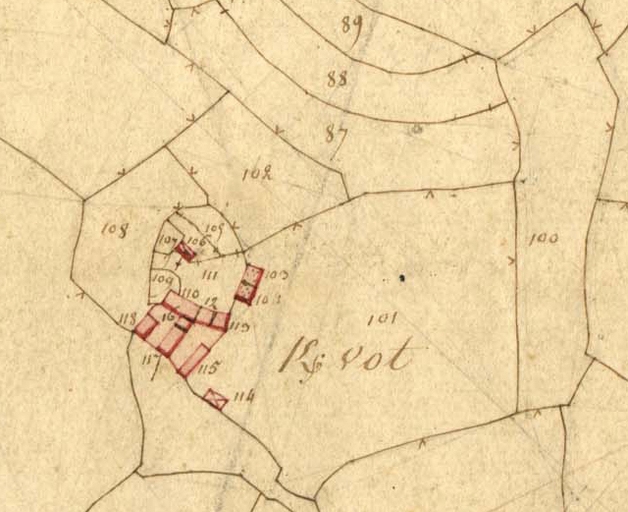 Extrait de la feuille D1 du cadastre ancien de la commune de Trégrom, 1834 : Kervod (Kervot)Immatriculation
