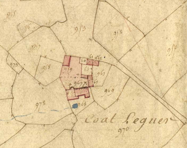 Extrait de la feuille D2 du cadastre ancien de la commune de Trégrom, 1834 : le manoir de Coat LéguerImmatriculation