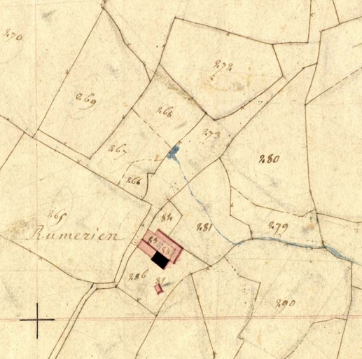 Extrait de la feuille C1 du cadastre ancien de la commune de Trégrom, 1834 : ferme de Rumérien (en noir)Immatriculation