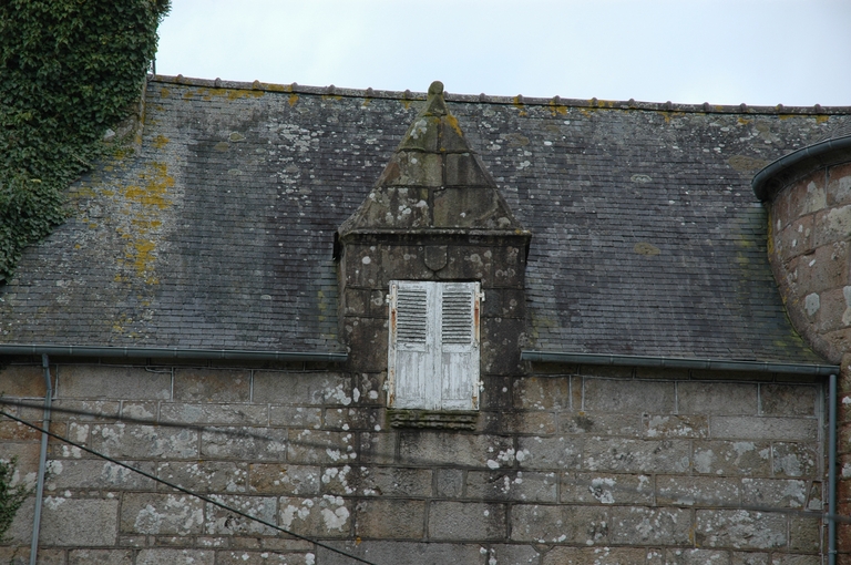 Elévation antérieure orientée vers l´ouest-nord-ouest : détail de la lucarne nord à fronton-pignon triangulaire arborant des armoiriesImmatriculation
