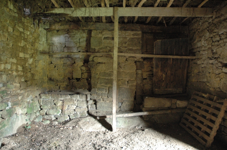 Logis puis étable, vue intérieure, cheminée (murée) et auges de forme rectangulaire servant de mangeoires accostées au pignon nordImmatriculation