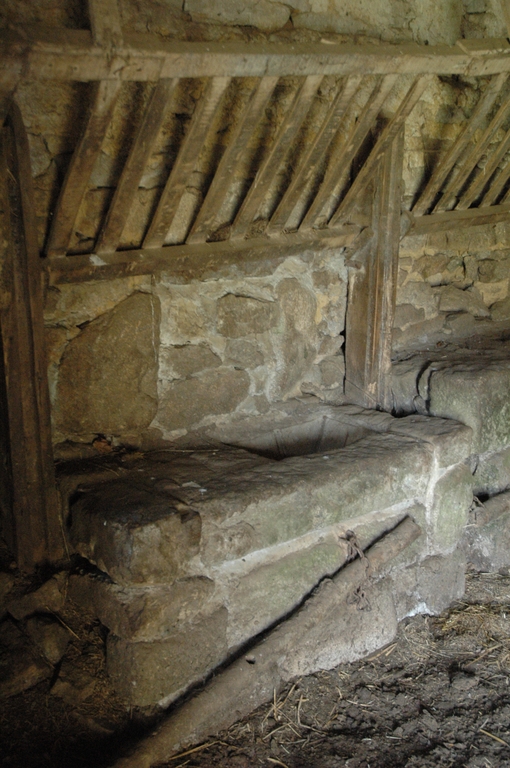 Logis puis étable, vue intérieure, auges de forme rectangulaire servant de mangeoires et râteliers à foinImmatriculation