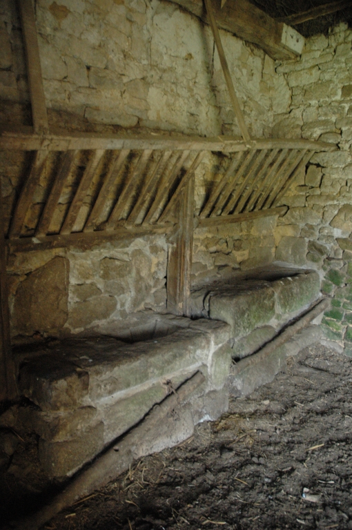 Logis puis étable, vue intérieure, auges de forme rectangulaire servant de mangeoires et râteliers à foinImmatriculation