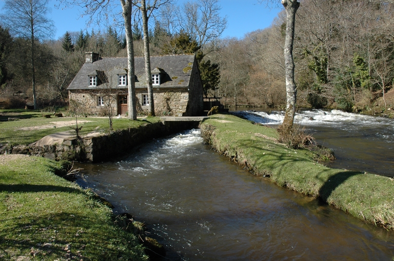 Vue générale du moulin à eau situé sur la rive est du Léguer. Au premier plan, le biefImmatriculation