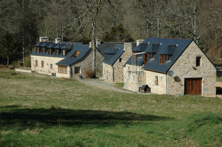 Trégrom, Pont Coz : vue de situation du moulin situé à la perpendiculaire d'un alignement de trois édifices dont deux, les plus à l'est, sont postérieurs à 1834Immatriculation