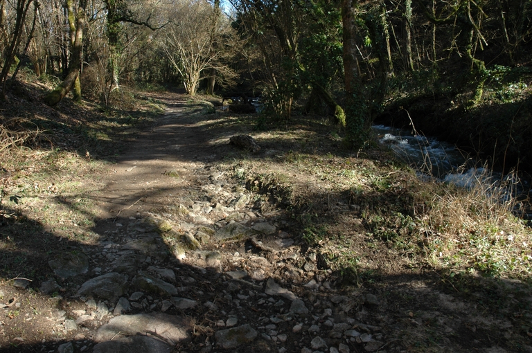 Vue du chemin venant du nord-est, longeant le Frout, et rejoignant le site du moulin du Saint et le vieux pontImmatriculation