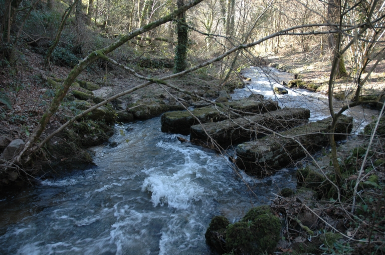 Vue d'une ancienne écluse ou pêcherie en maçonnerie dans le Frout, située entre le vieux pont et le site du Moulin du Cleuziou à l'ouest (édicule ne figurant pas sur le cadastre parcellaire de 1834)Immatriculation