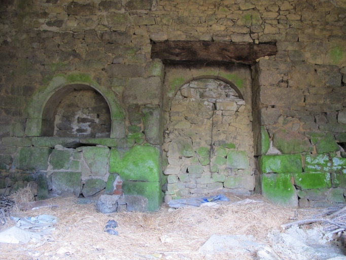 Ferme puis étable, vue intérieure, porte en arc plein cintre nord, saloir et pierre à saler mural et cheminée de l'étageImmatriculation