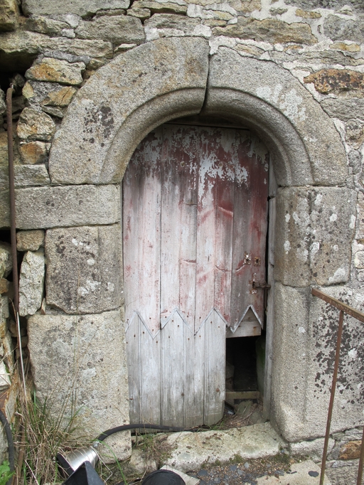 Plougras, Kerradenec : ancien manoir. Logis à étage, étage, détail de la porte en plein cintre mouluréeImmatriculation