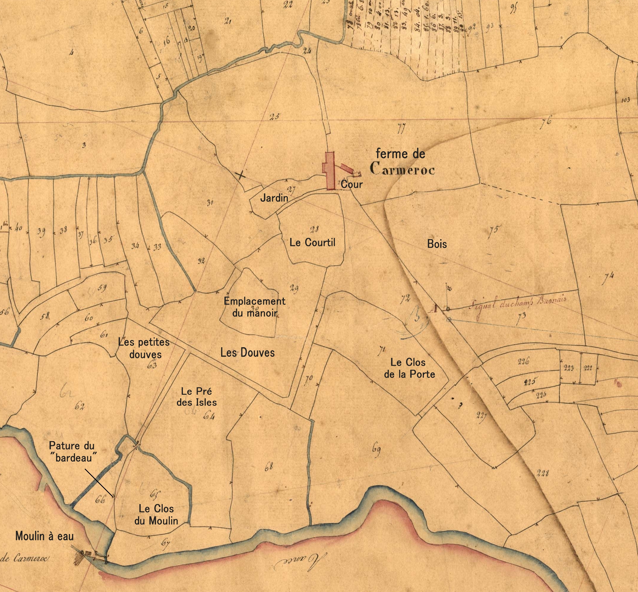 Extrait du cadastre de 1833, moulin et ferme de CarmerocImmatriculation