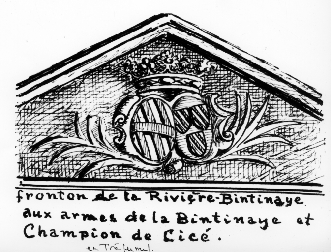 Fronton de la Rivière-Bintinaye aux armes de la Bintinaye et Champion de Cicé, croquis de Frottier de la Messelière, 1896Immatriculation