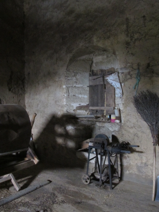 Vue intérieure, ancienne chambre transformée en grenier, fenêtre murée sur le mur arrièreImmatriculation