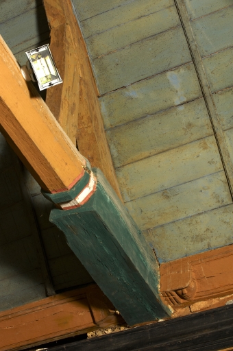 Intérieur : nef, détail d'une sablière et d'un entrait à engoulantImmatriculation