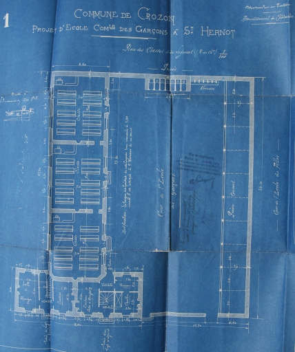 Projet d´école communale de garçons à Saint-Hernot (plan des classes et des logements) par l´architecte H. Ruer, 1908 (AD Finistère 2 O 333)Immatriculation