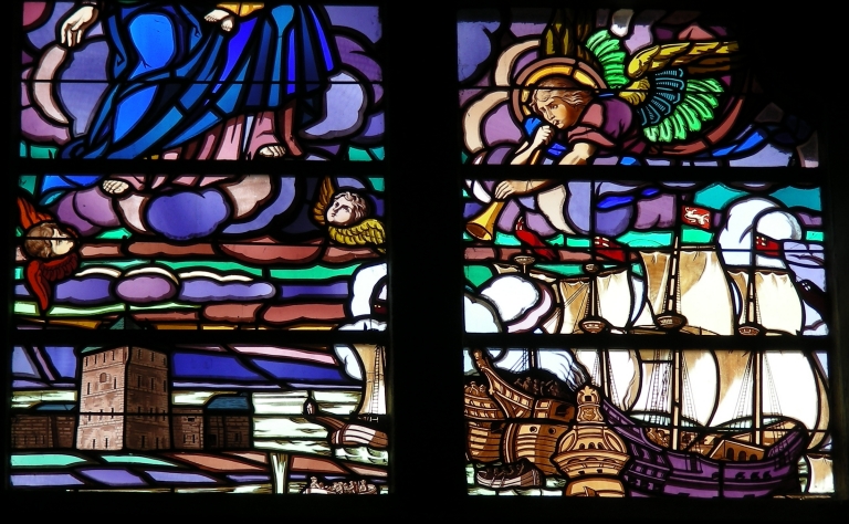 Faux transpet nord : vitrail de Jim Sévellec (la bataille de Camaret contre les Anglais, 1694), détail avec la tour Vauban et les bateauxImmatriculation