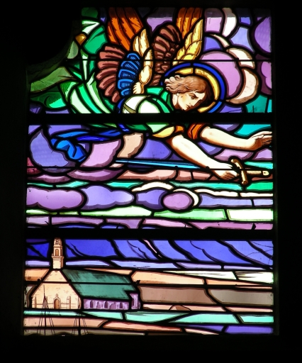 Faux transpet nord : vitrail de Jim Sévellec (la bataille de Camaret contre les Anglais, 1694), détail avec la chapelle Notre-Dame de RocamadourImmatriculation