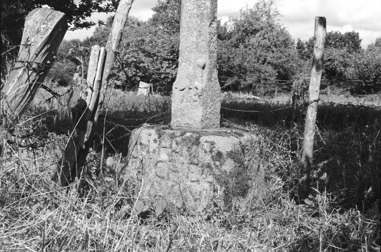 Croix de chemin, détail du socle.Immatriculation